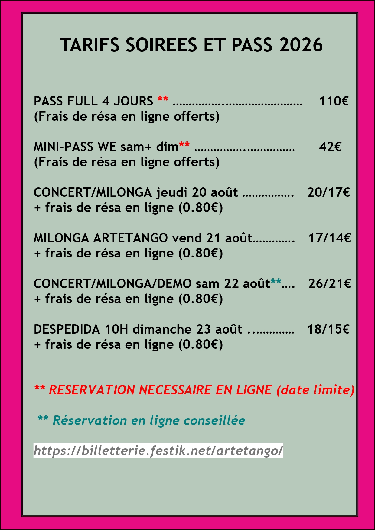 Vous pouvez TOUT réserver en ligne (sauf les entrées au Bals de la tarde qui se font sur place) >>> Si vous préférez venir sans réserver, vérifiez avant de venir sur notre site qu’il reste bien des places le jour même ! La billetterie en ligne n’est plus accessible 6 heures avant chaque soirée, mais cela ne signifie pas que c’est complet !!!
