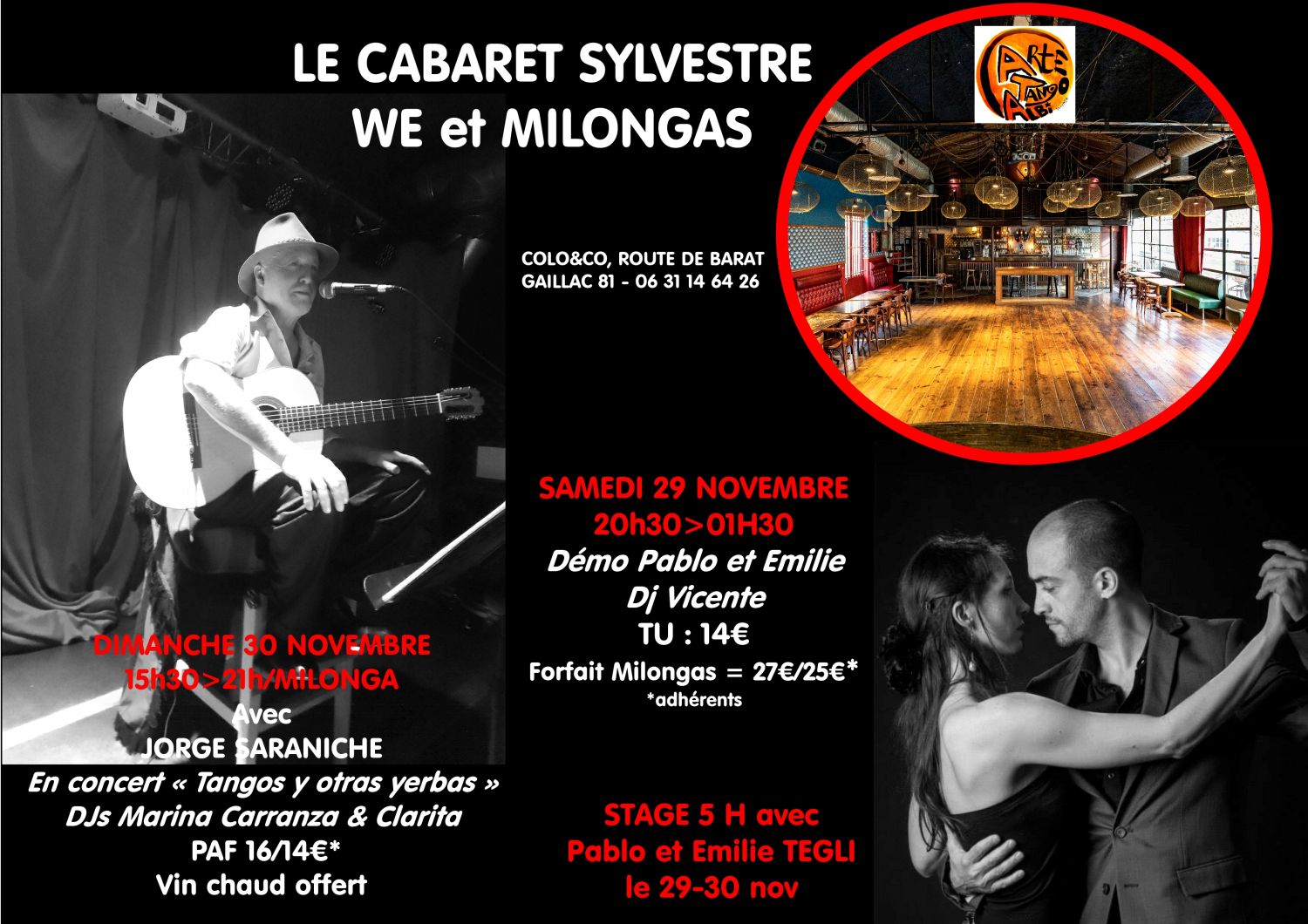 CABARET SYLVESTRE le dimanche de 15h 30 à 21h (Concert dansant avec Jorge SARANICHE (guitare, voix) +  DJettes Marina+Clarita+ vin chaud offert)  ! et une feria TANGO le dimanche aprem (ramenez tout ce que vous voulez vendre, vêtements, chaussures, bijoux, etc étiquetés avec votre nom et prix)